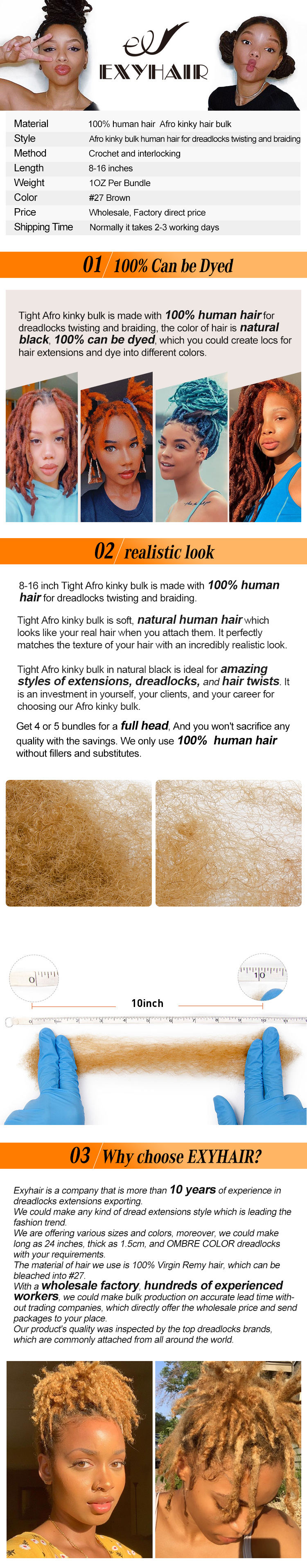 Exyhair #27 Tight Afro Kinky Bulk 100% Human Hair for Ideal to Make/ Repair Afro Hair Braids, Dreadlocks Extension, Afro Twist